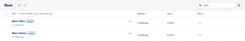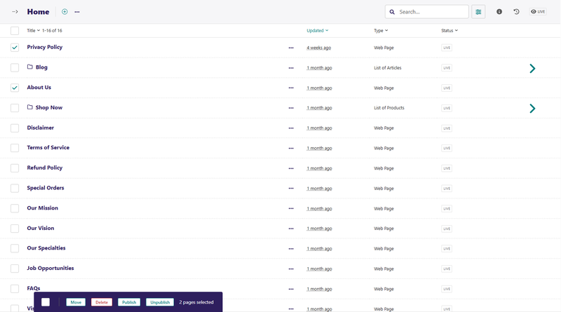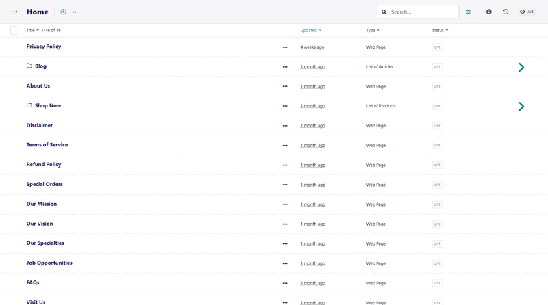 If you hover over a child page, you get an arrow on the right-hand side of that child page row. Clicking the arrow displays a further level of child pages. The screenshot below shows Blog and Shop Now, with an arrow on the right-hand side. Clicking the arrow for Blog displays all blog posts, whereas clicking the arrow for Shop Now displays all product pages.