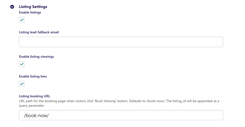 - Listing booking URL - this is the URL path for the booking page when visitors click 'Book Viewing' button. Defaults to /book-now/. The listing_id will be appended as a query parameter.