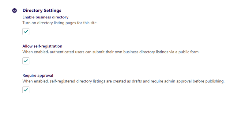 - Require approval - When enabled, self-registered directory listings are created as drafts and require admin approval before publishing.