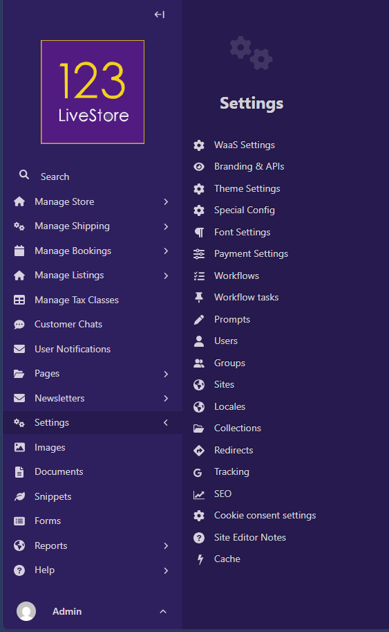 There are several settings you need to configure to achieve a unique and functional e-commerce site. Click 'Settings' in the left navigational bar to see all settings options: