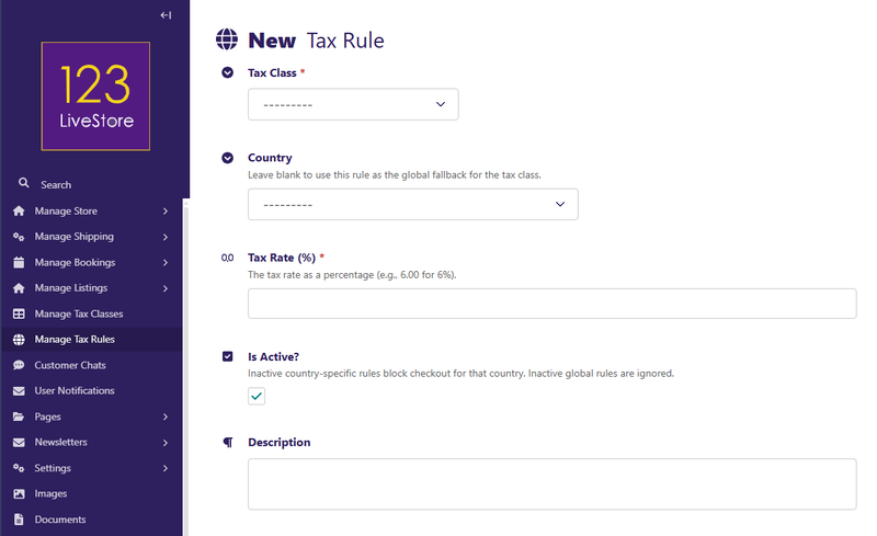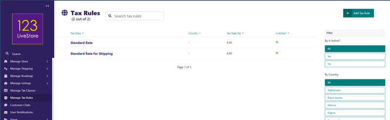 Manage Tax Rules is the admin screen where you define reusable country-specific tax-rate profiles (for example, SST 8%, Shipping Fee SST Tier-1 6%, etc.) and then attach them to products and shipping rules.