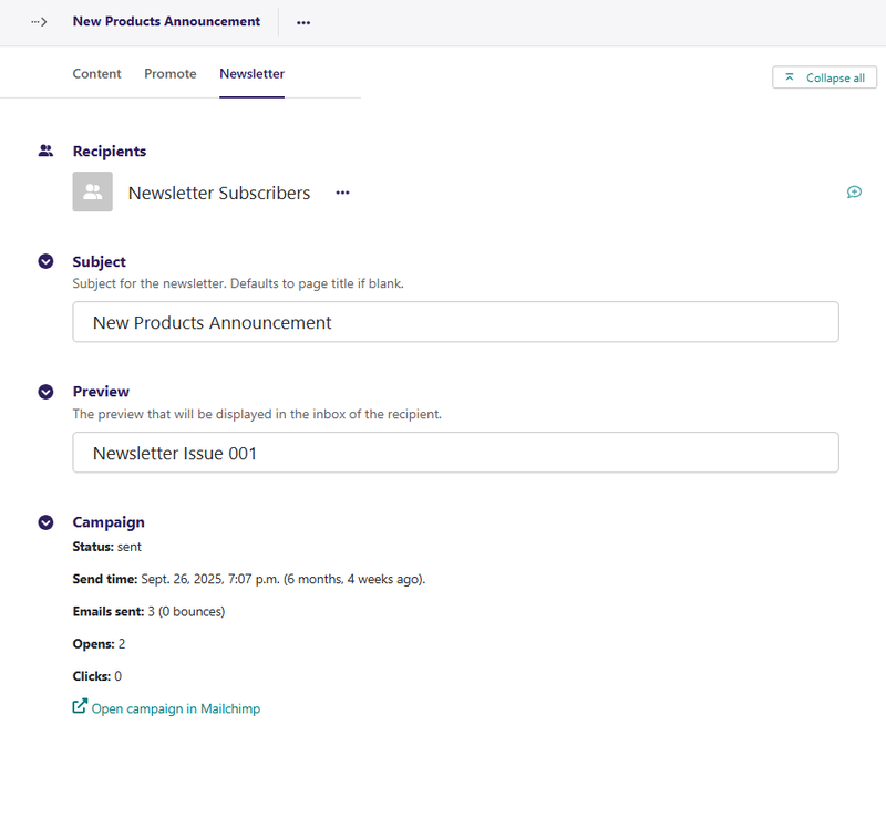 The Newsletters feature allows the site admin to create and send newsletter campaigns for individual content pages. It comes with a Mailchimp backend out of the box, including support for MJML to render email-compatible HTML.
