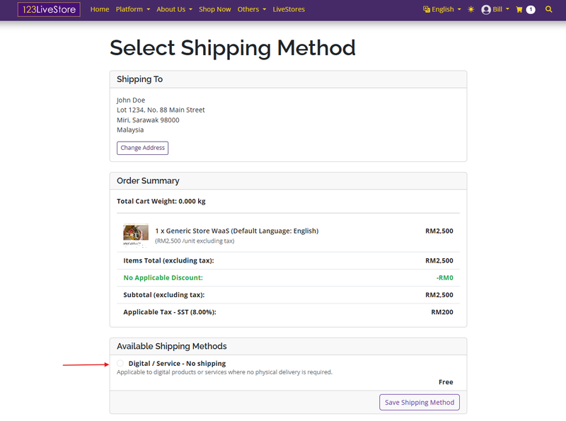 Since the template is a digital/intangible product or service, there is no shipping involved. Click the only option under 'Available Shipping Methods' - 'Digital / Service - No shipping', and click the 'Save Shipping Method' to proceed to the payment stage: