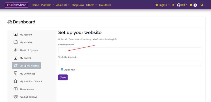 Now that your payment status is "Paid" you can proceed to the next stage, which is to "Set up my website". Click the link in the left navigation sidebar, enter the domain name of your website, and click 'Save'. If you want the site to deploy immediately, make sure to check the 'Deploy now' box. Deployment can take between 3 - 12 minutes. Upon completion, you will be able to access your website to customise it to your liking.