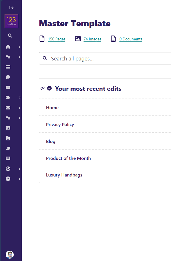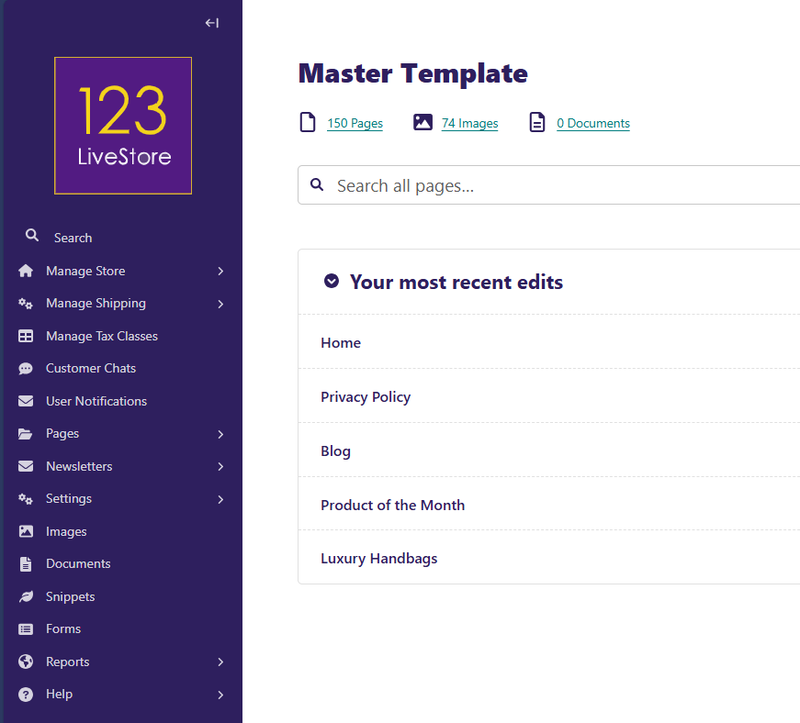 The Sidebar helps you quickly access your content as well as template features and settings. The items on the Sidebar can vary depending on what access you have been granted. A standard template installation has these main features in the sidebar: Search, Manage Store, Manage Shipping, Manage Tax Classes, Customer Chats, User Notifications, Pages, Newsletters, Settings, Images, Documents, Snippets, Forms, Reports, and Help.