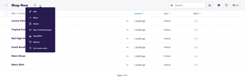 If you hover over a child page, you get an arrow on the right-hand side of that child page row. Clicking the arrow displays a further level of child pages. The screenshot below shows Blog and Shop Now, with an arrow on the right-hand side. Clicking the arrow for Blog displays all blog posts, whereas clicking the arrow for Shop Now displays all product pages.